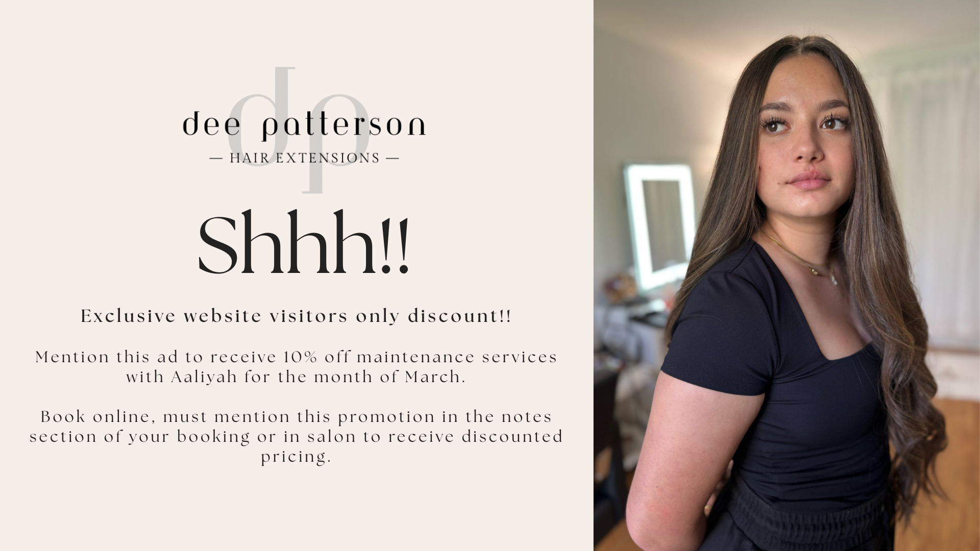 Book nowAaliyah is our junior stylist and is a valued part of the Dee Patterson Hair Extensions & Training team and brings genuine passion, care, and attention to everything she does.